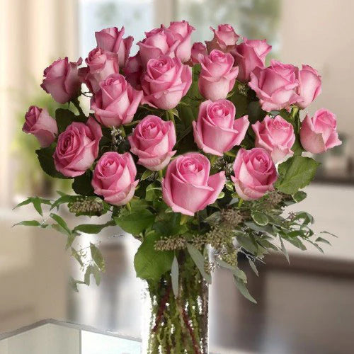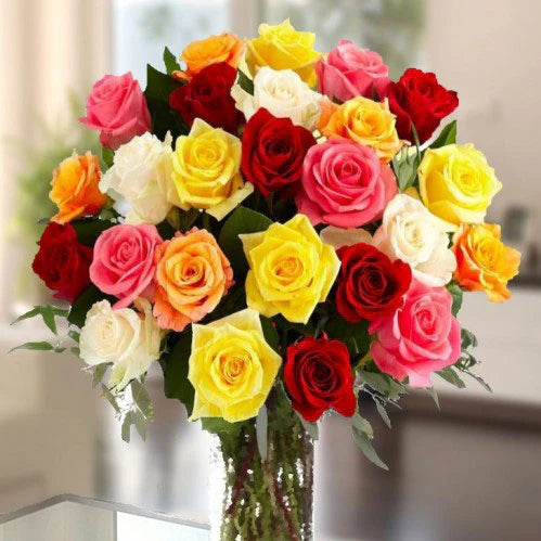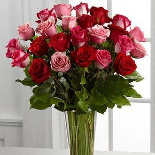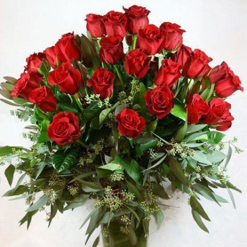 25 stórar 60cm rósir í öllum litum m/grænu. Kort er innifalið í verði.